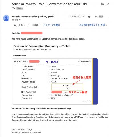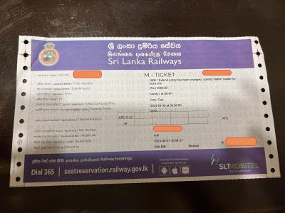 自分は、3つの予約をもっていたので、それぞれの予約のメールを日本出国時に印刷して、Colombo Fort で3つの予約メールの紙とパスポートを提示して、3つの M-Ticket を発券してもらいました。