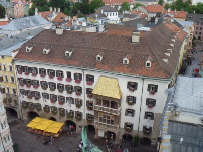 インスブルックの観光で黄金の小屋根を見に行きました。街並みがとてもきれいなのも感動しましたが、金箔が張られた屋根にも驚きました。また、銅像の格好をした大道芸人等も周辺にいて、非常に面白かったです。黄金の小屋根の前には、街並みを見下ろせる塔があり、一度登ってみるのもおすすめです。