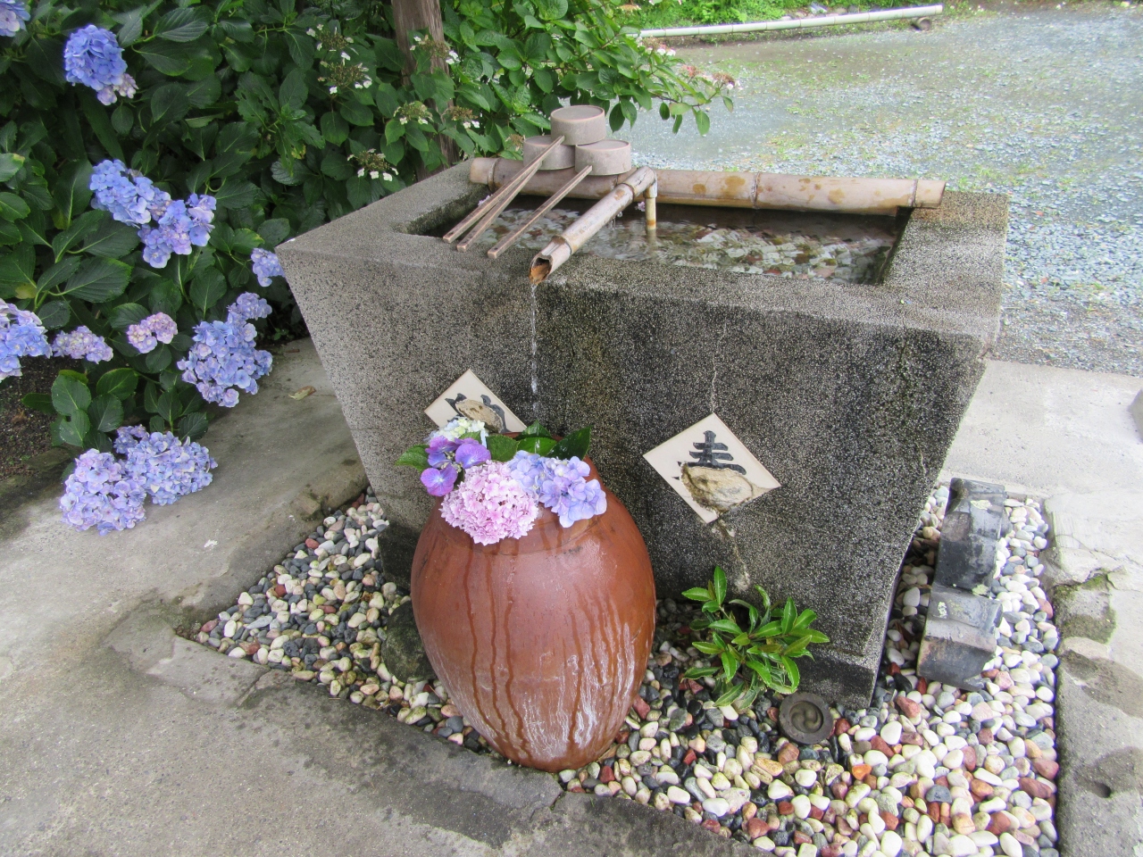 養老年間、寺を開創した僧行基が「極楽へゆく人の乗る紫の雲の色なるあじさいの花」と詠んだことにちなんで、境内の表参道から裏山の木立まで紫陽花が植えられています。