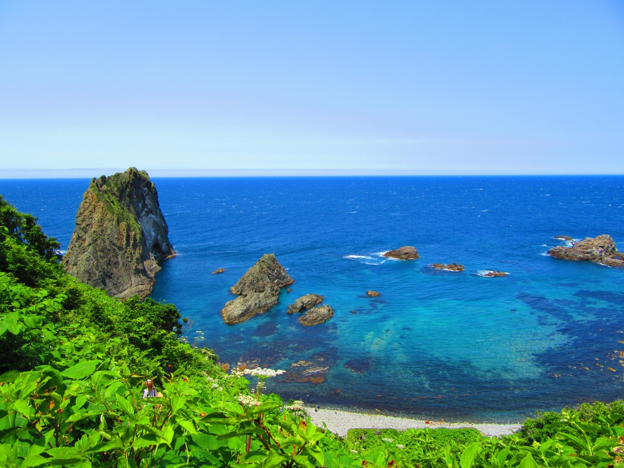 電灯のない真っ暗な歩行者用のトンネルを抜けると、突然目の前いっぱいに真っ青な海が広がって、いきなり感動です。まさに積丹ブルーと言われる海は透明度も高く、海中の岩なども上から見る事ができます。日本の渚百選にも選ばれているだけあって観光客も多かったです。