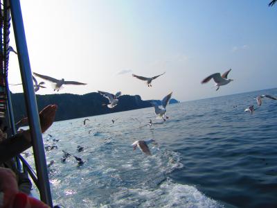 積丹ブルーの美しい海や海岸線、飛び交う海鳥を船上から楽しめます。船底の展望室では海の中を覗く事ができます。あまり魚を見る事はできませんでしたが、ウニはいっぱいいました。海の景色と海中を楽しんだ後は、カモメの餌やりです。係りの人がボールいっぱいに食パンの耳を渡してくれるので、観光客は一斉に飛んでいるカモメに向かって放り投げます。かなり迫力ある面白い体験ができました。
