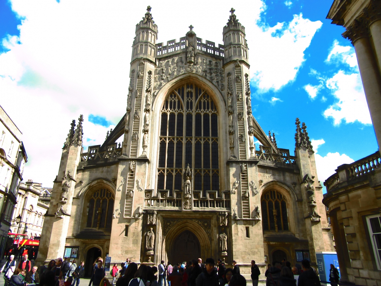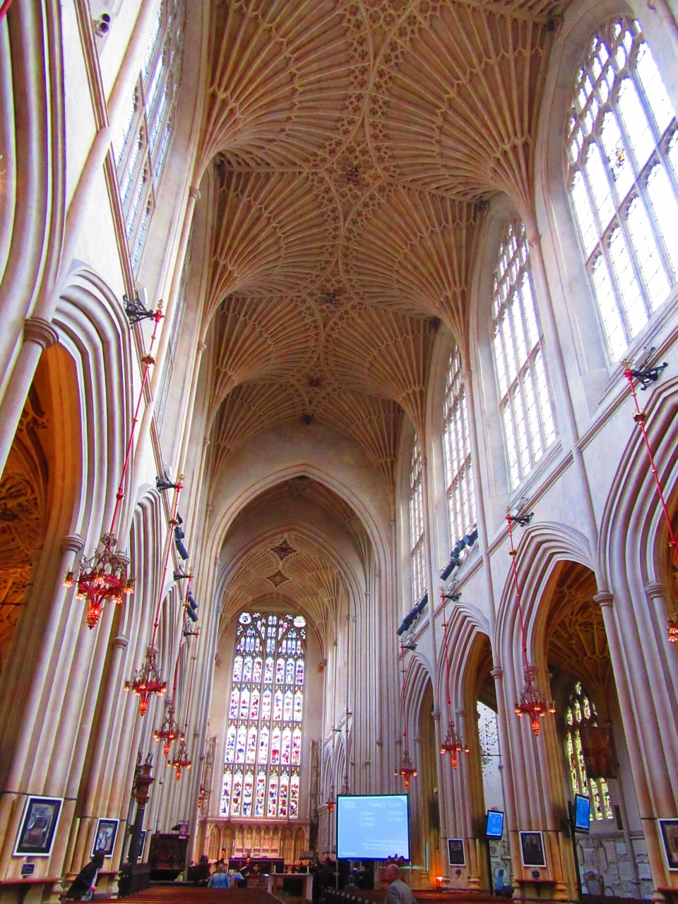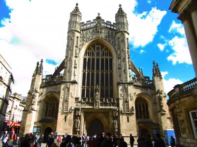 バース市内の中心にあり街のランドマークとして有名な寺院です。拝観料は無料ですが、入り口で3ポンドほど寄付金を払って中に入ります。特に強制ではないようですが、気持ち良く見学したかったので払いました。こちらの大聖堂は、もともとは修道院だったようですが、現在は英国教会になっているようです。教会内に入り正面目を向けると、祭壇と、素晴らしいステンドグラスが目を引きます。扇状の天井も見ごたえあります。祈りの場所なので皆静かに見学していました。