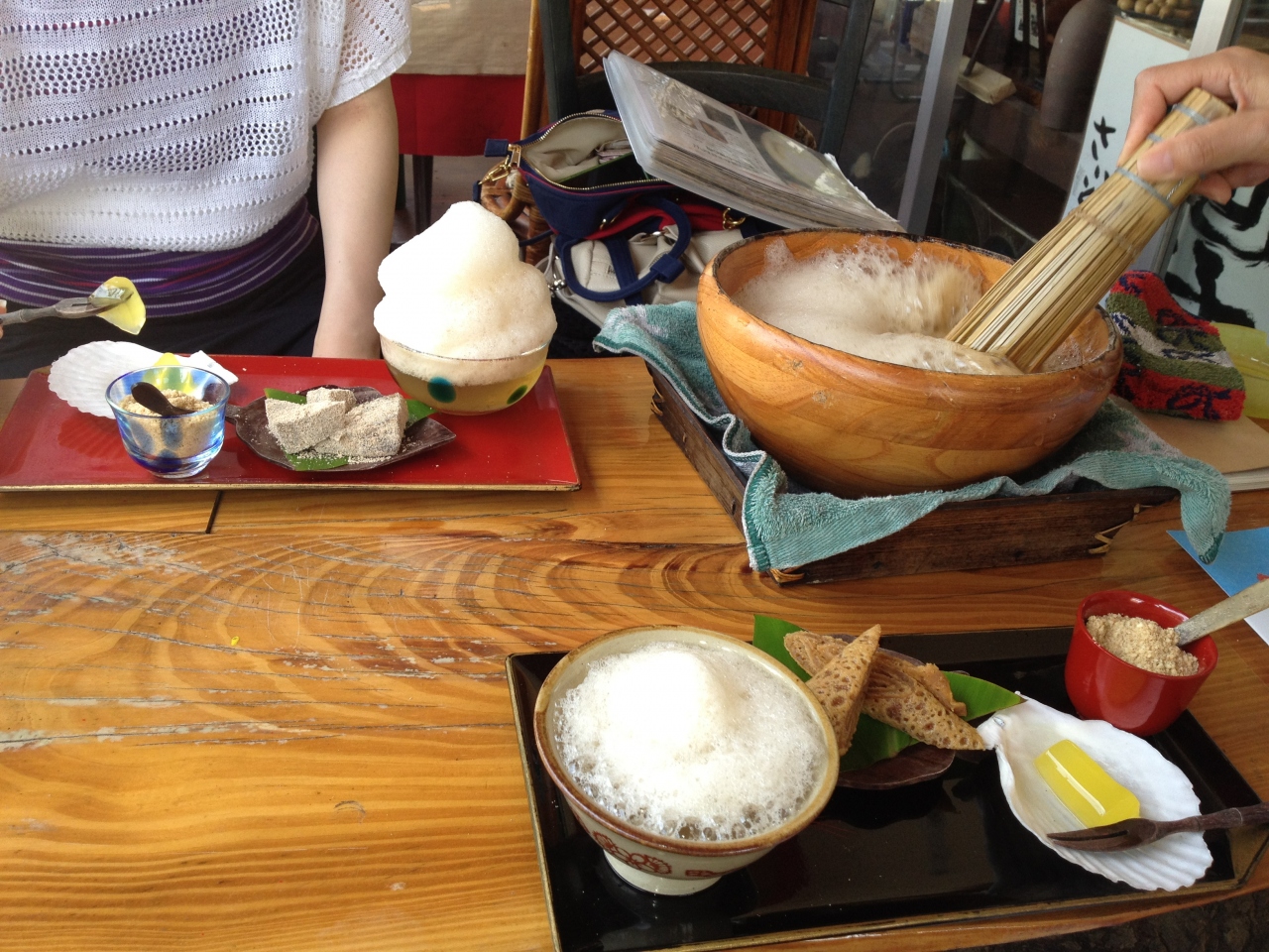 大きな鉢に入ったお茶をササラで泡立てて