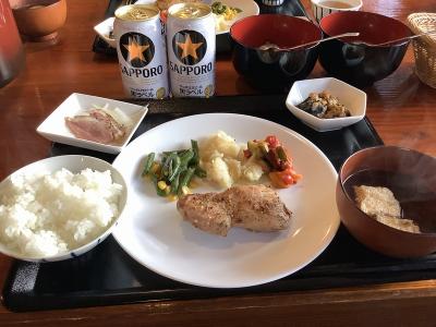 17時半からの夕食は洋風の鶏肉料理……うまうま!もちろんサッポロ黒ラベ...