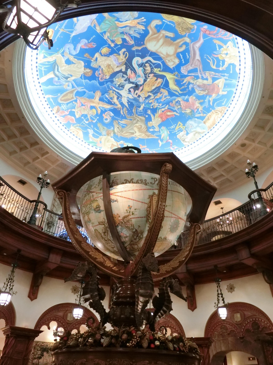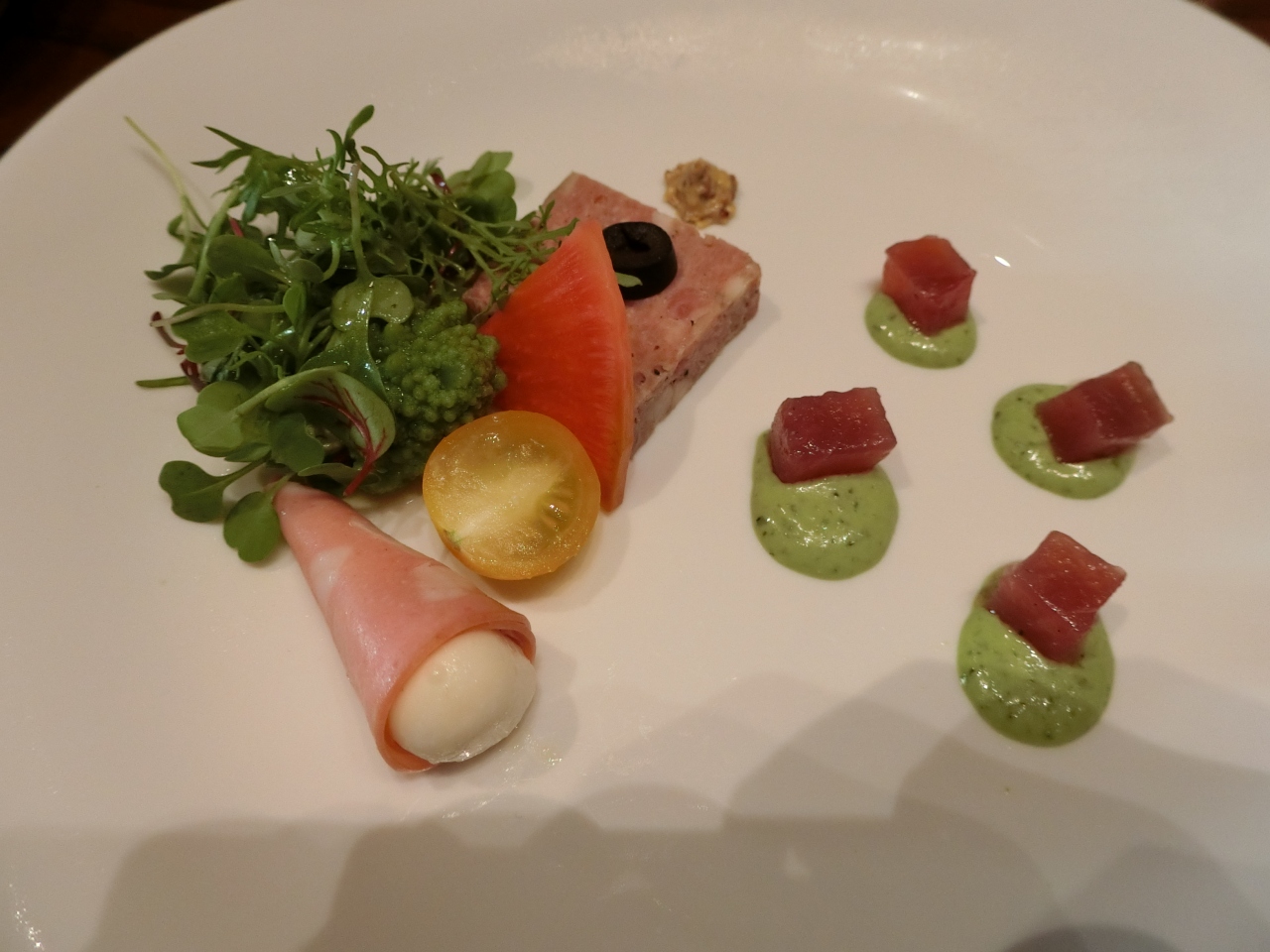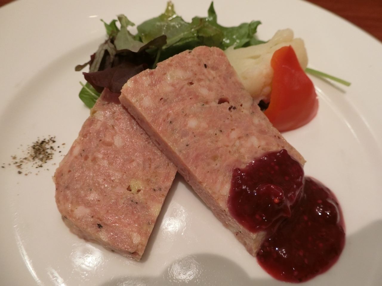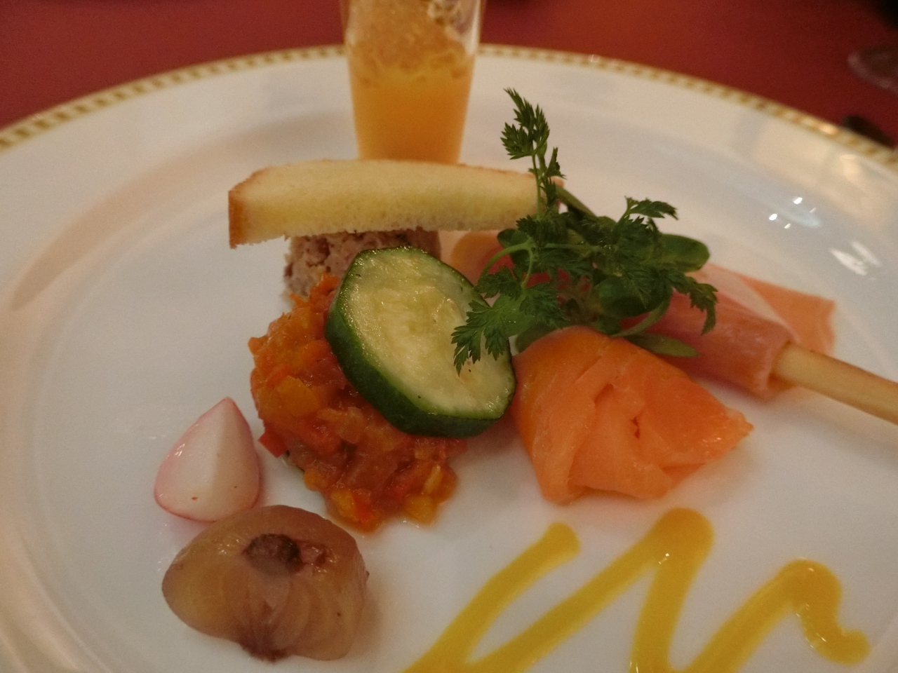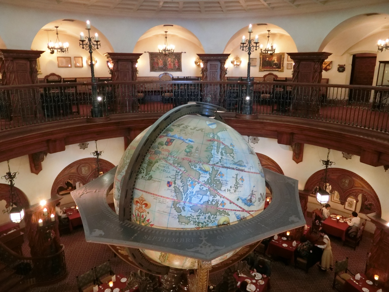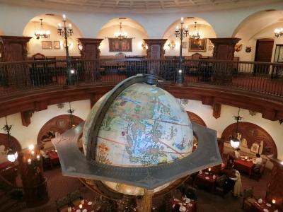 有名な地球儀の見える席で4500円のコースをいただきました。ドリンクフリーはもうやってないようです。前菜、メイン、デザートを数種類から選択していくプリフィクスコースです。