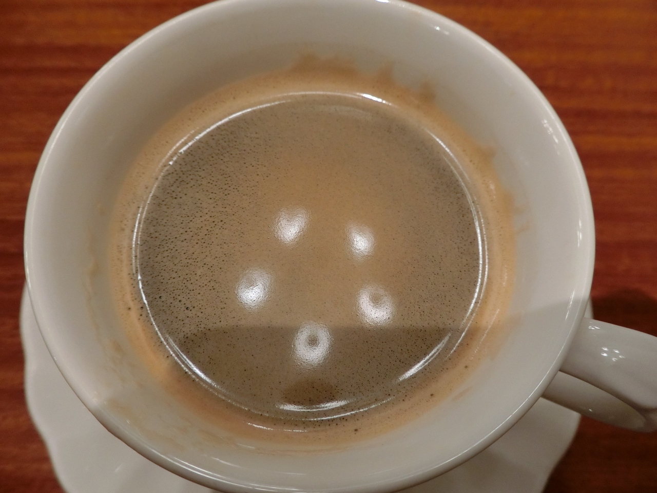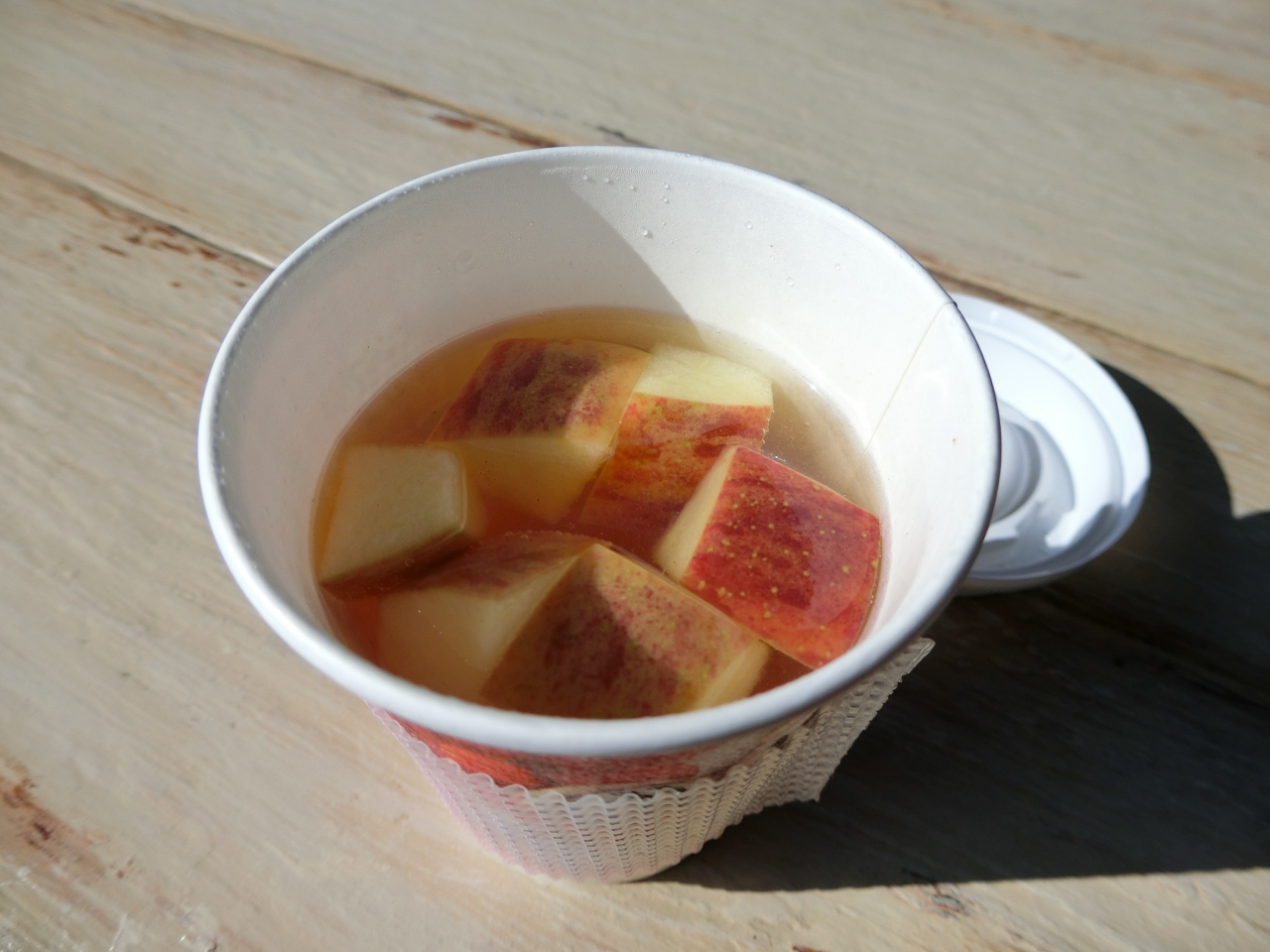 朝食代わりにリンゴ入りホットドリンクを購入しに来ました。ドリンク自体は甘酸っぱいリンゴ味、という感じの味です。底のほうにシナモン風味のシロップが入っているので、スプーンで混ぜ混ぜしながらいただきます。甘いのに、しつこくなくてサッパリしてるのは生の角切りリンゴが入っているせいでしょうか。
