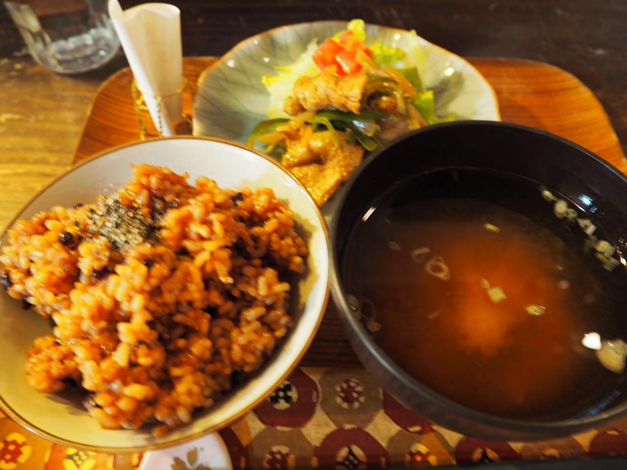 お昼時に伺うと、地元の常連さんと思われるお客さんが多かったです。ここは小豆を混ぜて炊いた玄米ご飯のランチがいただける、珍しいカフェです。その時はものすごくお腹が空いていたわけではなく、ご飯とお味噌汁におかずが一品というセットと、デザートに豆腐ティラミスを注文しました。ご飯はもちもちとして味わいがあり、ごま塩だけで十分おいしくいただくことができました。全体的に味付けは良かったと思います。豆腐ティラミスはコーヒーの味がとても印象に残っています。店員さんも親切で、高知に行く際にはまた訪問したいお店の一つになりました。