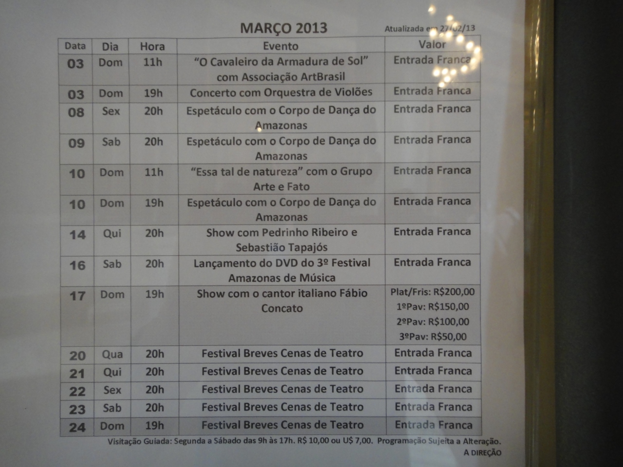 アマゾナス劇場では、無料コンサートが多く開催されます。日時が合えば、ヨーロッパと同じ馬蹄形の豪華な劇場のバルコニー席に陣取って、フルオーケストラのコンサートを無料で楽しむ事ができます。スケジュールの確認は Webで探すことはできませんでいたが、劇場に直接行けは、1階のロビーに、A4くらいの紙に 1か月間の予定が掲示されています。係の人に、コンサートのスケジュールは何処 ? と尋ねれば、すぐに教えてもらえました。写真で、右側に Entrada Franca と書かれている公演が無料です。