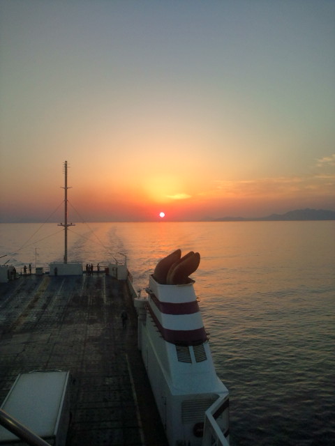 小豆島の坂手港から神戸港はフェリーで3時間ほどで結ばれています。小豆島から夕方にこのフェリーに乗ると素晴らしい景色が楽しめますよ・・・(私の場合10月に行ったので、日没などはそれを考慮してください)。まずは、16時20分に出発してすぐに瀬戸内海に沈む夕日が見られます。しばらく余韻にひたっていると、だんだん星空がふえてきます。2時間ほどすると、淡路島に近づき、島の夜景をみていると、明石大橋のイルミネーションが近づいてきます(これがすばらしい)。船は橋の真下を通過するので、この前後がクライマックスです。最後は船から見た神戸市街地の夜景です。これが全部フェリー料金のみで堪能できるのでぜひ行ってみてください。船の甲板は寒いので、防寒具を忘れずに。