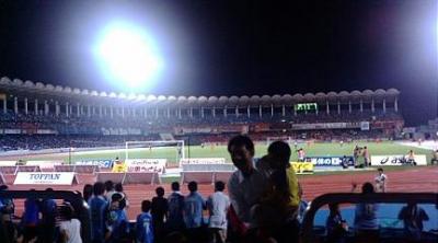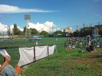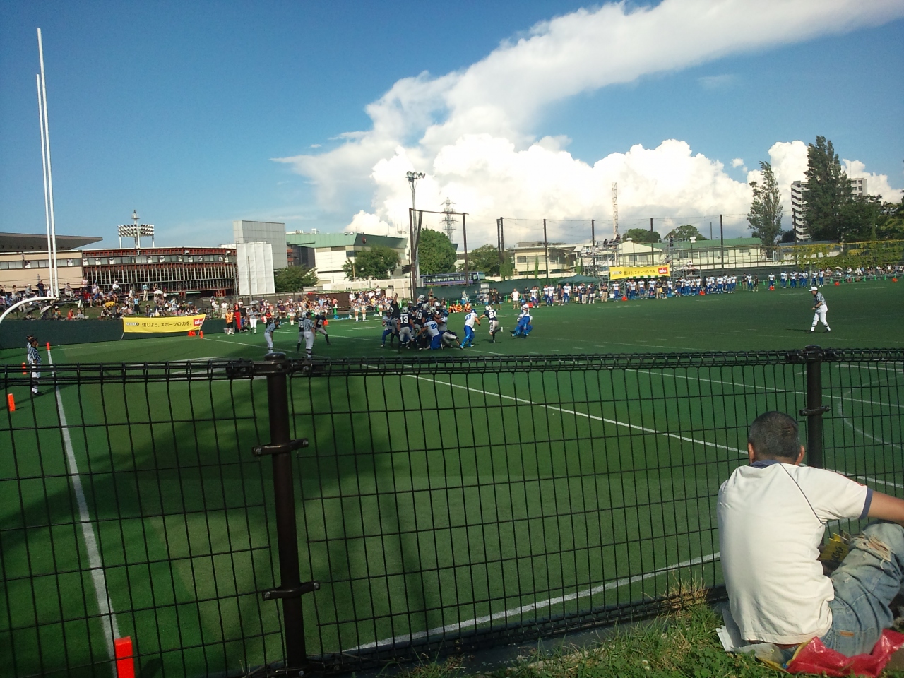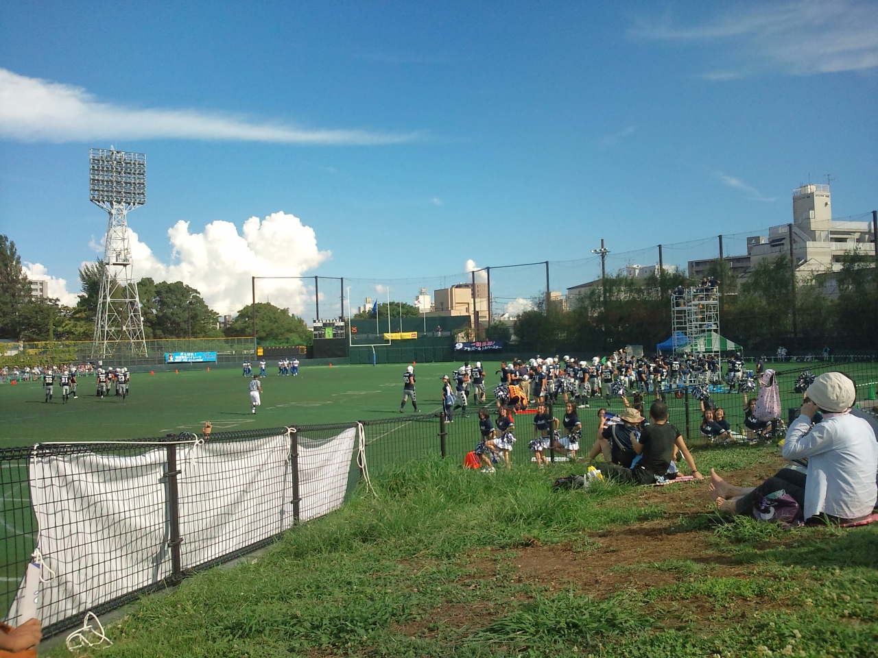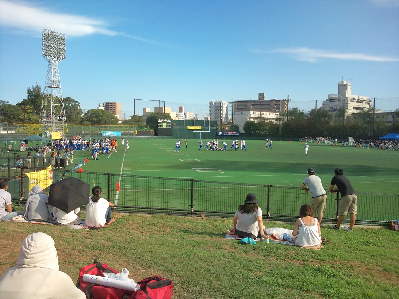 川崎球場は川崎駅から近い、アメフト専用のスタジアムです。もとはプロ野球の球場でしたが、生まれ変わりました。東日本のリーグや学生リーグが開催され、ファンや家族づれが芝生に座ってアメフト観戦を楽しんでいます。