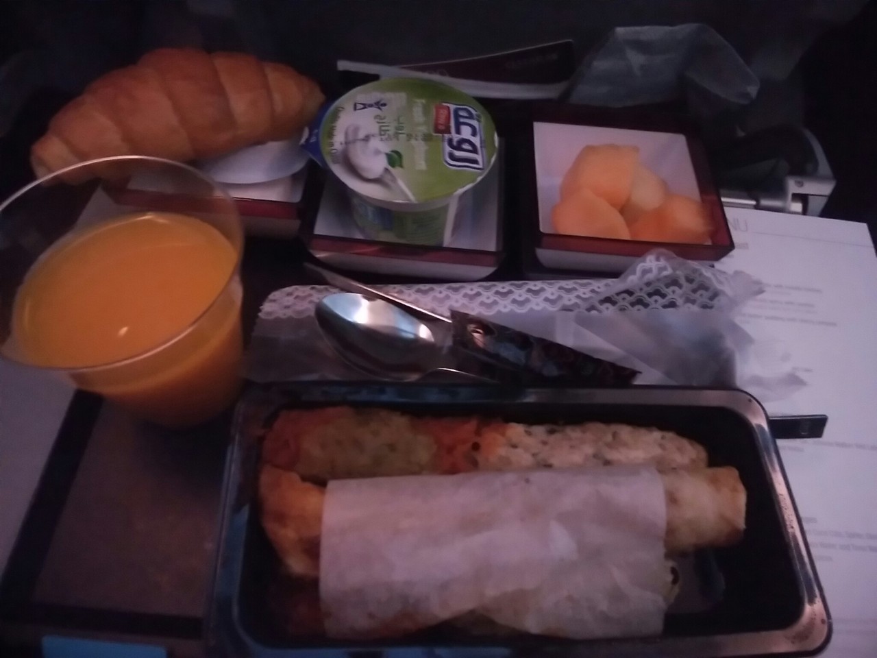 私は今回初めて宗教食のヒンディーミールを予約しました。スパイスの効いた本格的カレーがメインです。ナンも付いていました。朝食もスパイシーな豆を巻いた春まきのようなロールが出ました。
