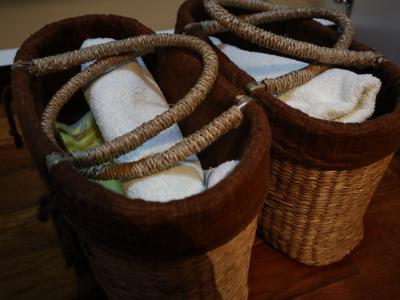 大浴場へ行くときはこの籠で。バスタオルは部屋から持参。小さいタオルは大...