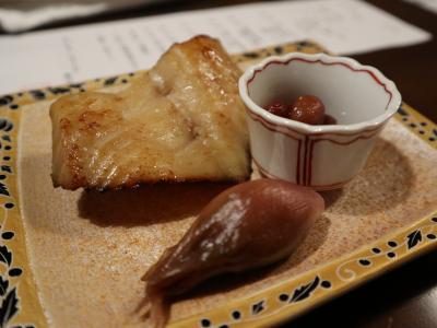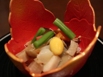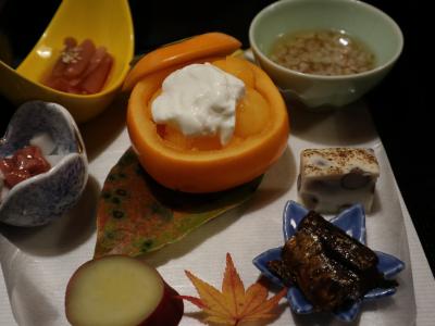 八寸:芋茎 むかご真丈 秋刀魚 酒盗 丸十含ませ おけさ柿ヨーグルトが...