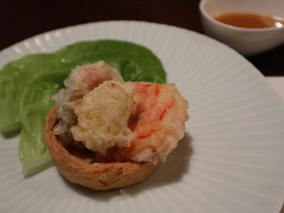 揚物:海老と無花果衣揚げ タルト釜 トマトソースお品書きには「海老と無...