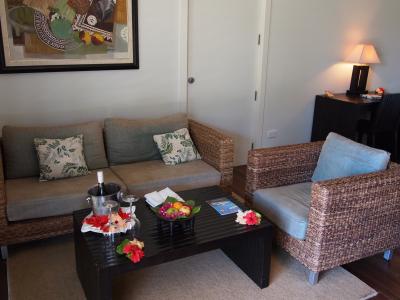室内はゆったりしており、コンプの水やフルーツ、チョコレートもありました。