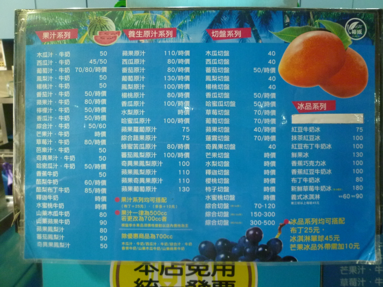 メニューはジュース、カットフルーツ、かき氷と