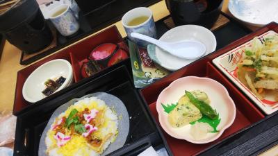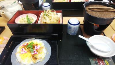 お一人このセットで昼食です。あさりのちらし寿司、しらすのかき揚げ、しら...