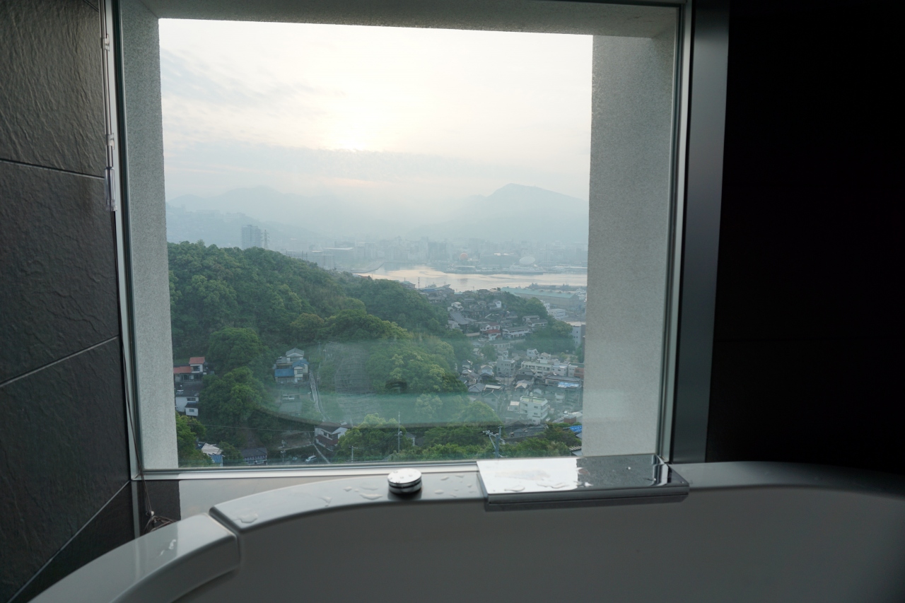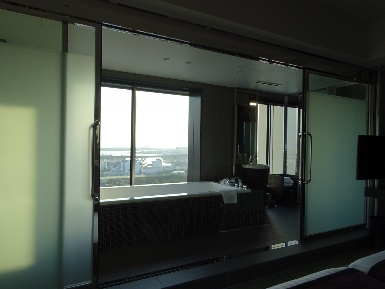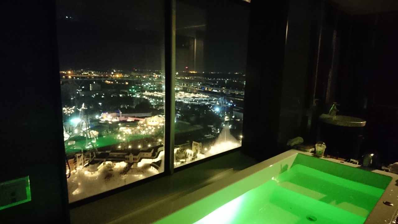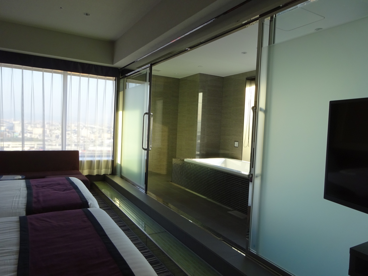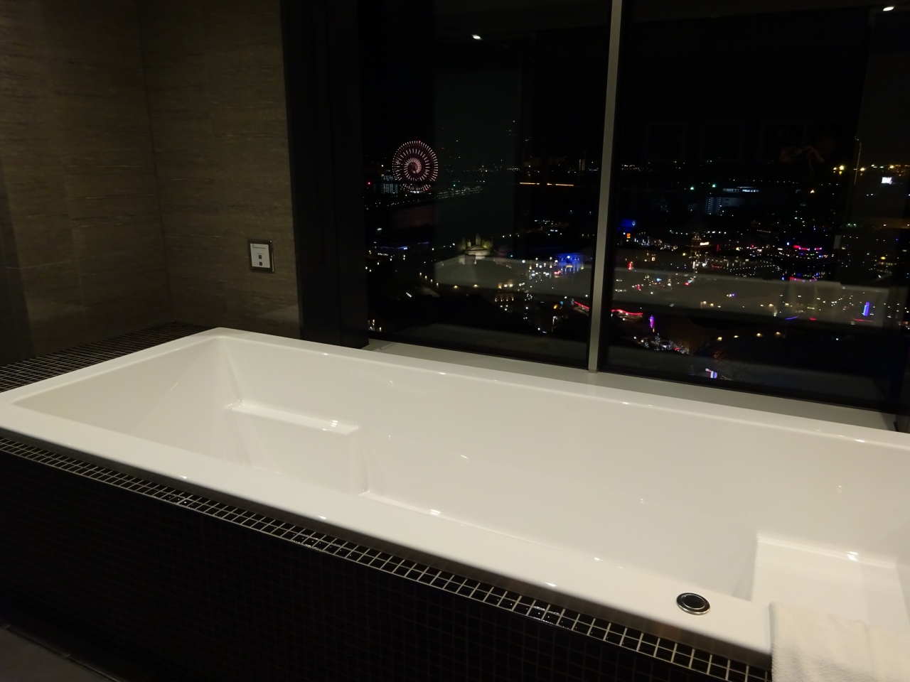 GWの前半に宿泊しました。USJから目と鼻の先。本当に近いです。お部屋はラグジュアリーフロアビューバスSを利用。HPに違わず素敵なお部屋でした。お風呂に入りながら、パークの絶景が堪能できます。長方形のバスタブは2人で入っても余裕がある位。アメニティーもスープや足のリラックスグッズなど、他ではあまり見かけないものもあって、良かったです。ベットも寝心地が良かった。朝食付きのプランだったのですが、GWの為通常7時からの所、6時30分から開始だったのも良かったです。宅配便で荷物を送っていたのですが、チェックインの時にはお部屋に既に入れて頂いていたし、宅配便を送る際にも、部屋まで荷物を取りに来て、宅配便のカウンターまで運んでくれました。サービスの点でも◎。総じて良かったのですが、良かっただけに気になった点を少し。皆が記載しているように、テーブルが少し狭いです。普段あまり部屋で食事をしないのですが、USJで遊んでテイクアウトして部屋で食べるという事が、考えられる立地だと思います。またデザイン的に仕方がないのかもしれないですが、トイレの扉が透明のガラスなのは、少し使いづらいです。夫婦と言えど、使用するときはバスと部屋の仕切りのドアも閉めて使用しました。お風呂に入る際、バスタブの方は暗くして、シャワールームは電気を点けて入りたかったのですが、シャワールーム個別の電気がなかったのが、少し不便でした。トイレの電気を含め、バス側の電気のスイッチは全て部屋側にあったので、最初スイッチを探してしまいました(^_^;)どれも些細な事なので、総合的にはとても良かったです。