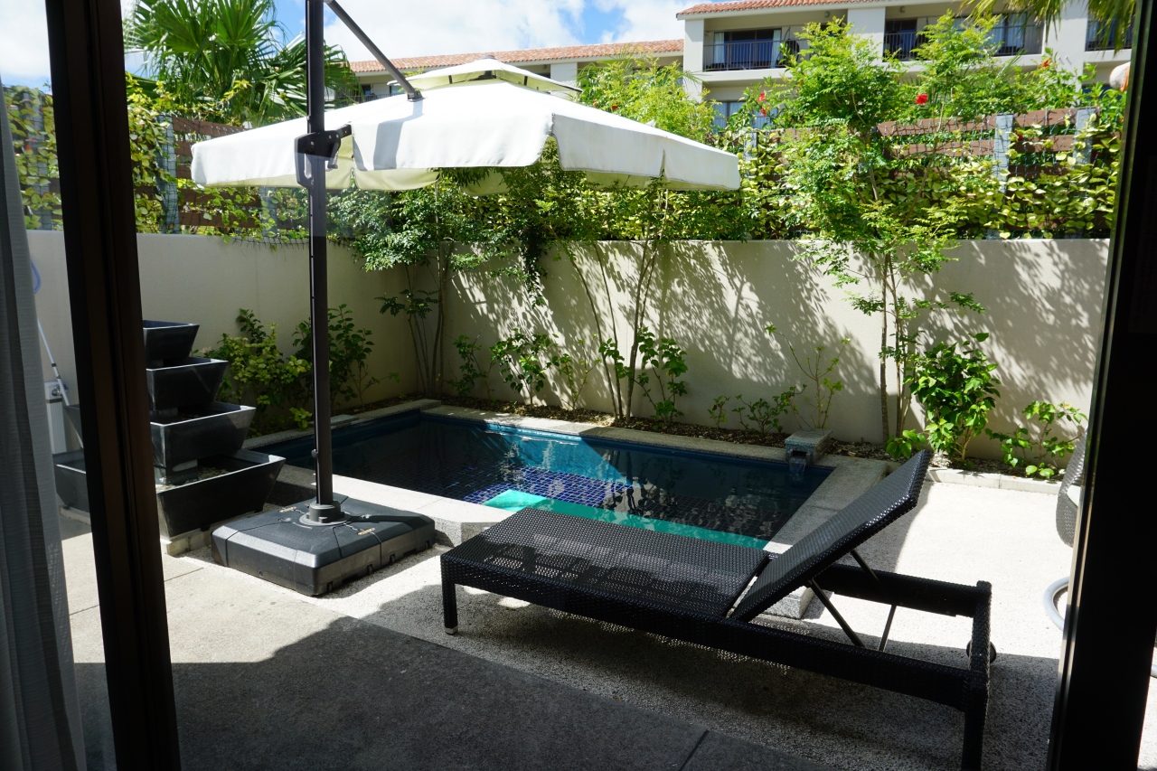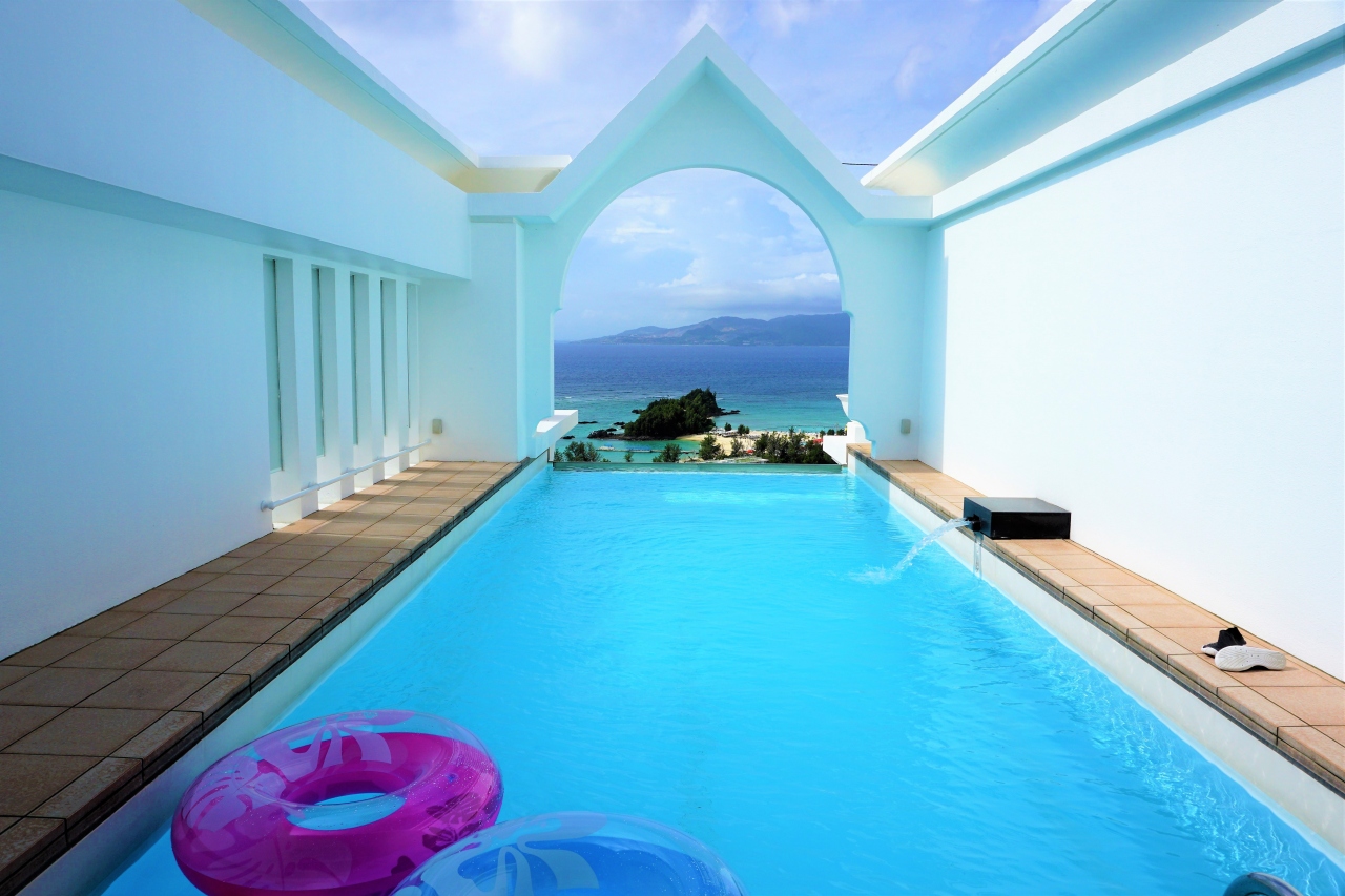 プール付きのお部屋の泊まりたくて、こちらのホテルを選びました。最上階のプライベートプールから海も眺められて、深さも広さも充分、プールの横にシャワーとトイレも設置されていて、とても快適に過ごせました。ラウンジの利用やバレーサービス等のホテルのサービスも良くてとても贅沢にのんびり出来ました。特典のカードが付いてくるので、3泊以上するのがおすすめです。ホテル自体は中規模のホテルなので、静かに過ごせました。姉妹ホテルの「かりゆしビーチリゾート・オーシャンスパ」と渡り廊下で繋がっていて施設も利用できるので、リゾート感も味わえました。記念の旅行とかにおすすめです。また泊まりたいホテルです。