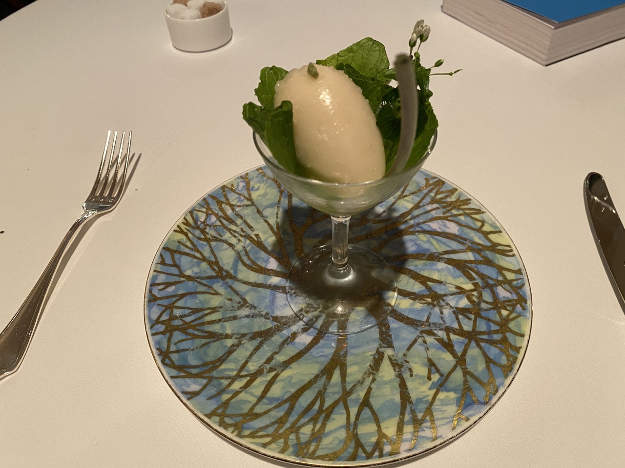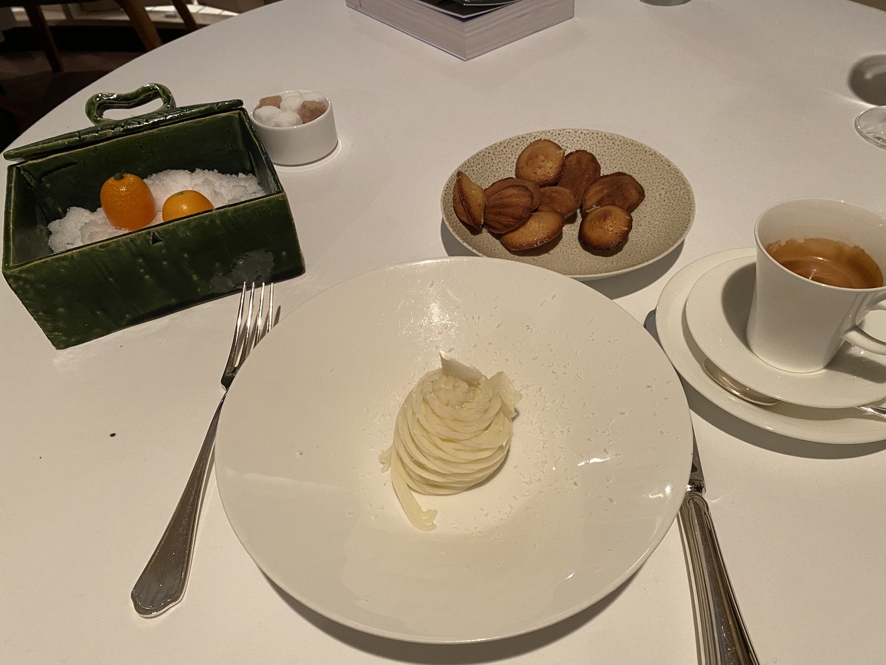 綺麗な彩り温野菜サラダ、活牡丹海老ソテー、蝦夷鮑烏賊墨リゾット添え、レモンティーソルベ洋梨ブランデー、十勝牛蕪味噌マッカリーナグラタン添え、ラクレットチーズ、グレープフルーツソルベ山葵、百合根モンブラン金柑マドレーヌエスプレッソは2度頂いたか