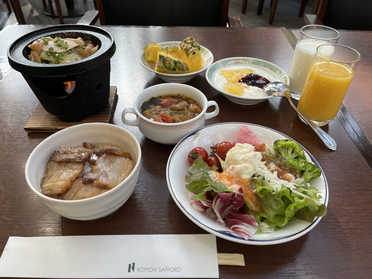朝食は数回頂きましたが海鮮丼は私には合わず、その代わりに豚が美味しくて毎度豚丼にして楽しみました。豚丼、ちゃんちゃん焼き、スープカレー、サラダ、町村農場牛乳が私には最高の朝食になりました!- 旅行時期