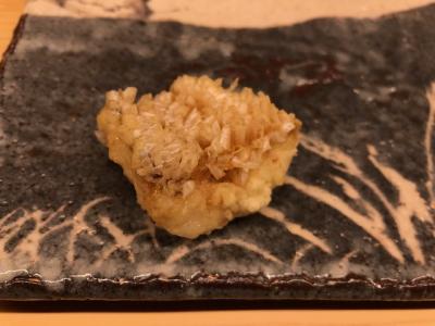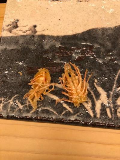 のりの天ぷらの上にうに、しろえびとキャビア なかなか美しいしうまい