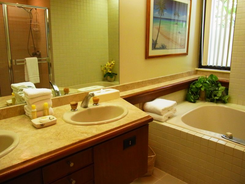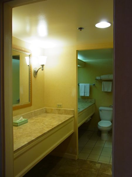 可動式シャワー(バスタブなし)付きのバスルームは狭いけれど手前にあるドレッサー?が便利でした。ワイキキ中心からは離れているけどホテルの前がトロリー乗り場なので不便はないです。