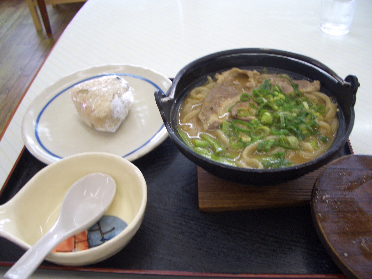 しらさぎ小麦の鴨味噌煮込うどんを注文し、どどめせおにぎりを皿に置いてレジへ。