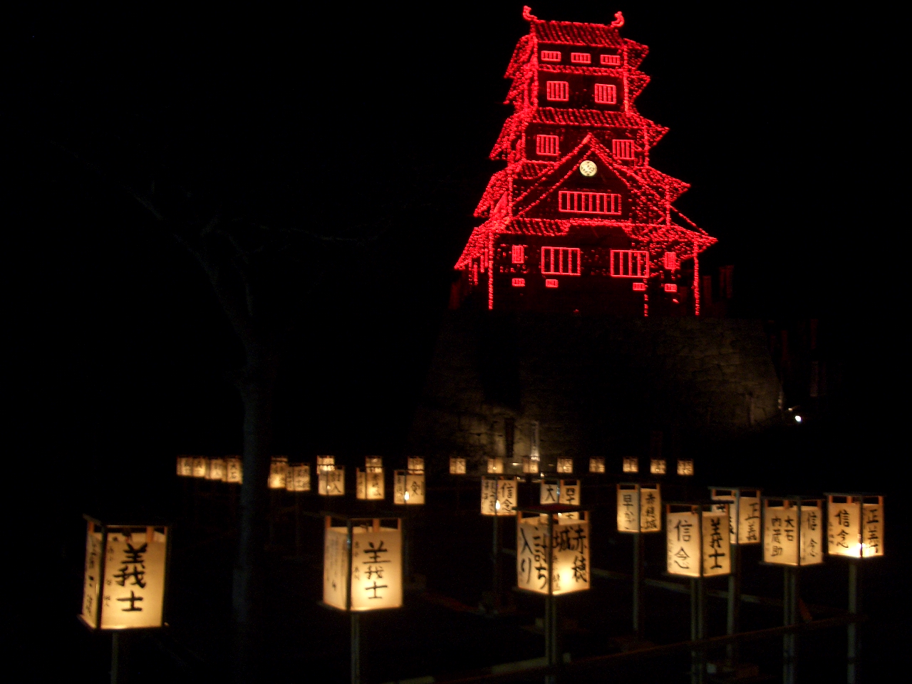 じっさいの赤穂城(大鷹城)は財政難などから天守は計画のみに終わったらしいのですが、義士祭の日が近くなると突如として本丸に雄雄しい姿を見ることができるようになります。