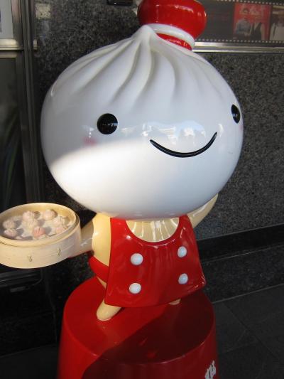 鼎泰豊のマスコット人形と写真を撮りながら、