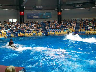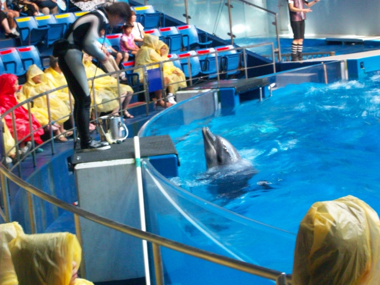 イルカパフォーマンスは、しぶきを浴びるほど近くで見るのが楽しい!オリジナルポンチョ(100円)の販売があります。