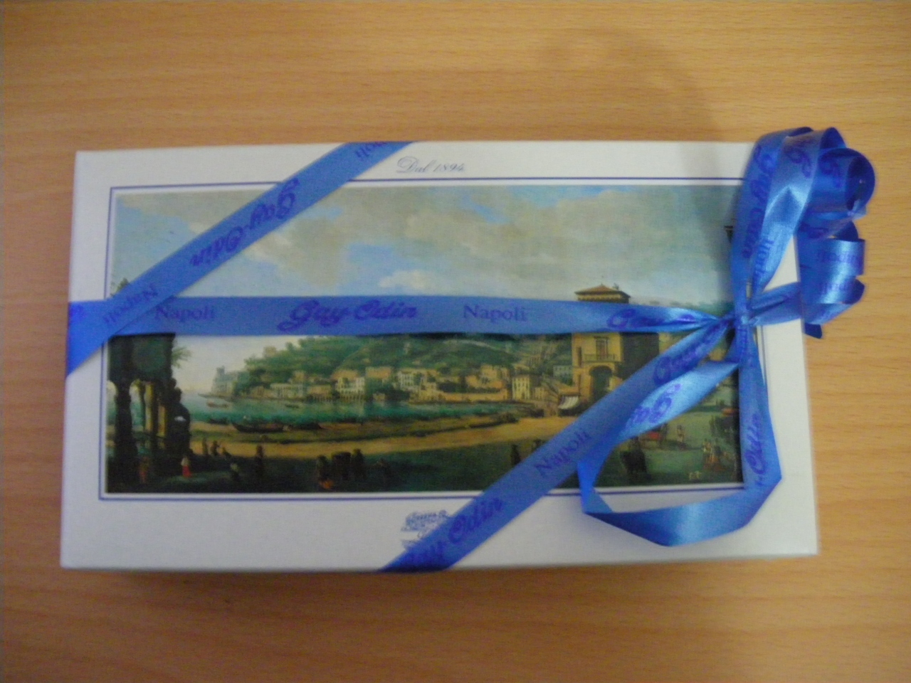 箱はナポリの絵が描かれた箱で、紙の物から高級な物まで数種用意されてますので、お土産に最適です。