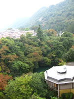 霧雨が降っていて、木々の風景に温泉の湯気と霧雨が重なって見えて