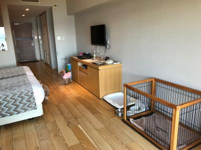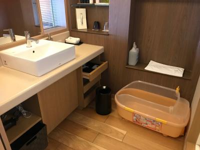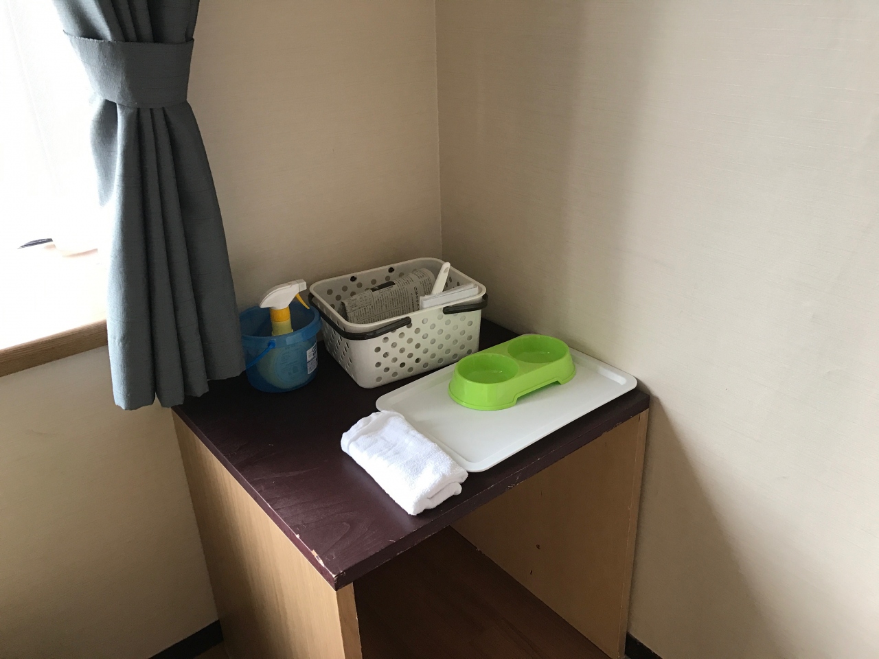 お部屋はペット同伴可能なお部屋だったので、特別広いわけではありませんが簡易ケージを置くスペースもあり、2匹までは1000円という最近では格安のペット料金なのにペットグッズが数点用意されていました。