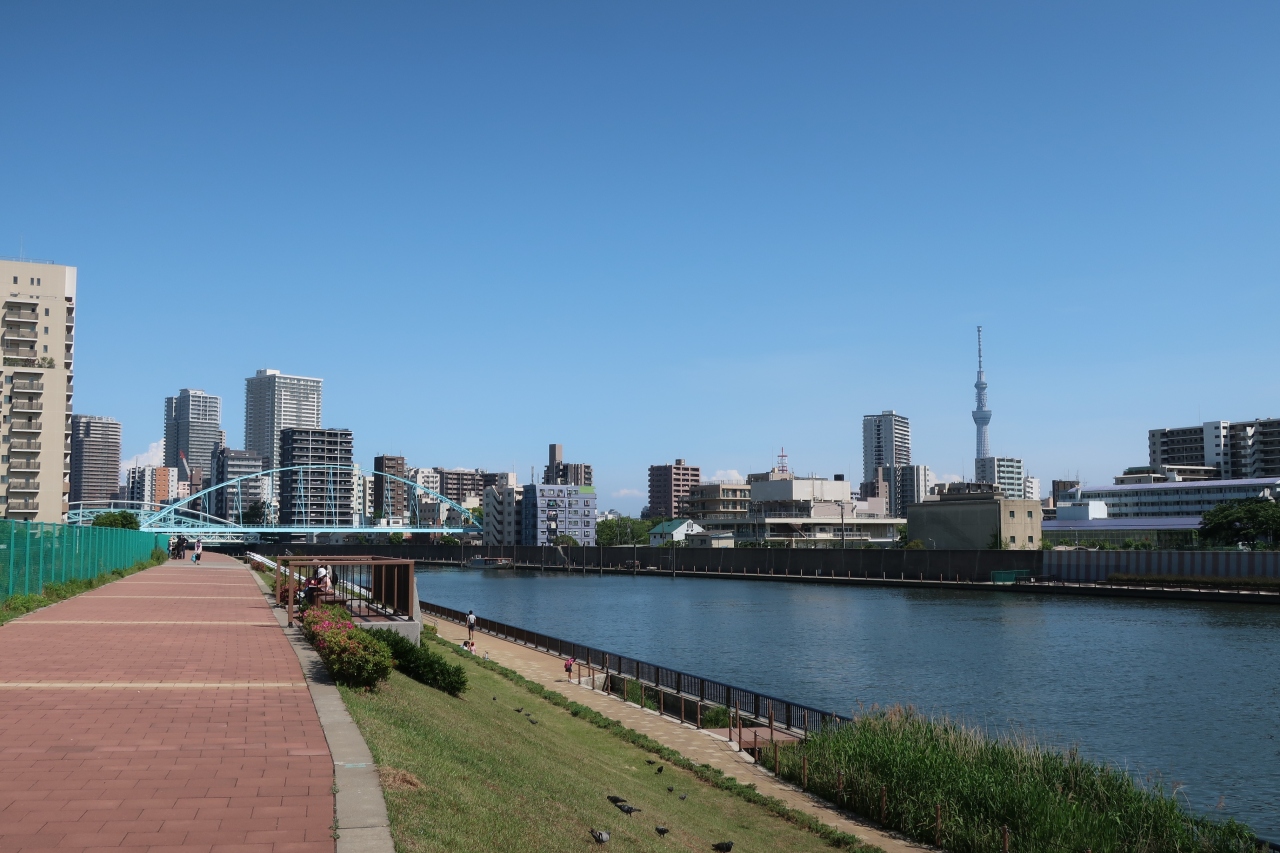 - 隅田川沿いの広いスペース公園で、すがすがしい