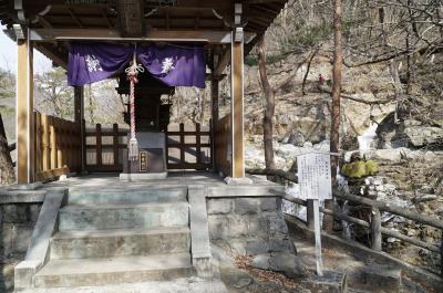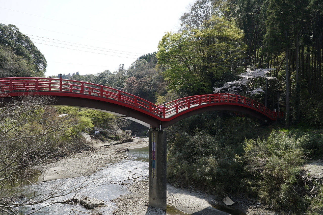 養老渓谷の遊歩道に行く前に、赤の二つ半円綱っているちょっと可愛い観音橋は見えます。目立つで、運転しながらも見過ごすことはないです。有料と無料駐車場があります。無料の方を選びます。橋の端に小さい出世神社あり、今回はここまで。