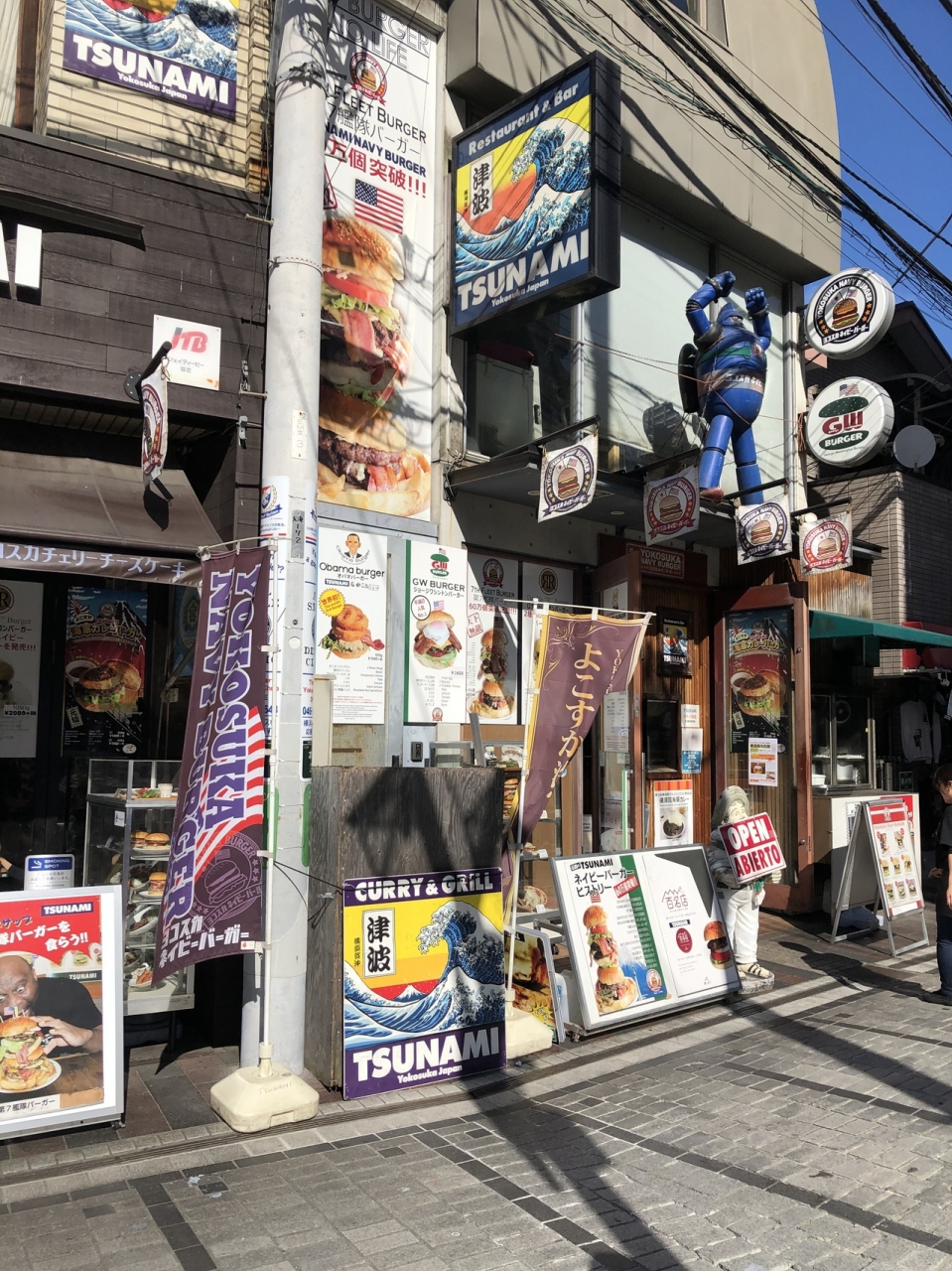 旅行行く一つ楽しみは現地の食べ物をいただきますよね。横須賀は東京からそうなに離れていませんが、米軍基地あるので、外国の雰囲気がします。商店街も、店も外国雰囲気で、客まで若い子ばかりです。さしぶりハンバーグを食べました。