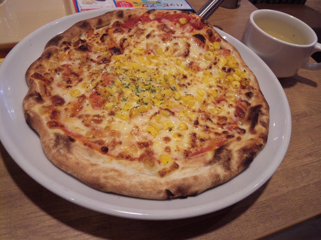 9月に十勝初上陸!2回目の訪問です。ハンバーグがメインのお店だけれど…今日、頼んだのはピザ!結構な大きさでボリュームがあります。大きさが分かるようにスープのマグを一緒においてます。この大きさで499円(税別)!一緒にクーポンでドリンクバー110円(税別)を付けました。お昼時を過ぎた14時ごろは空いていてお勧めです。