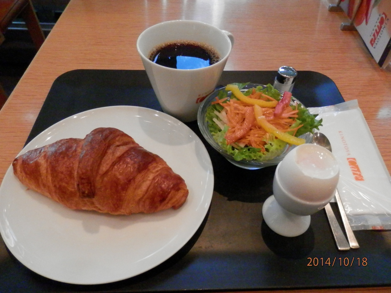 仕事前にモーニングセットを頂きました。今回は、クロワッサンセット。コーヒー・半熟ゆで卵・サラダのセット。通常は550円ですがクーポンを持っていて100円引き。つい先日もモーニングケーキセットを頂きました(笑)その時に頂いたクーポンで今回450円で頂けました。ちょっと残念だったのは、クロワッサンが冷たかった事。焼き立てだとばかり思っていたのでアツアツだと思ってました。これがアツアツだったら☆5つだったんですが…。次からはモーニングケーキセットにします。ケーキ単品が350円前後しますのでセットにするとお得です。ただし、8:00~11:00限定です。