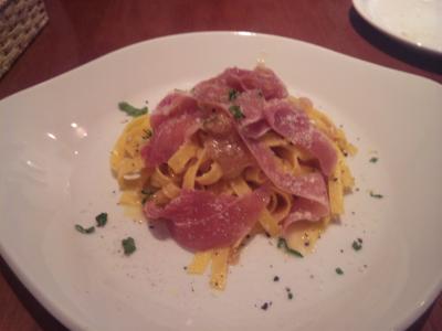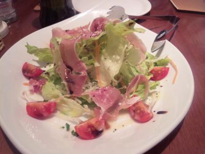 仕事帰り~職場の同僚に誘われて行きました。こじんまりとしたフロアで3人掛けテーブルが1つとカウンター6席くらい。3人で行ったのでテーブル席に。サラダを1つとそれぞれメインとデザート1つずつ。私は【生ハムと飴色玉ねぎのパスタ】とティラミスを注文。飴色玉ねぎが絶妙に美味しかった!パスタも平打ちで歯ごたえがあって◎デザートのティラミスは、もう一パンチが欲しい。思っていたより軽い味でした。でも美味しかったですよ。