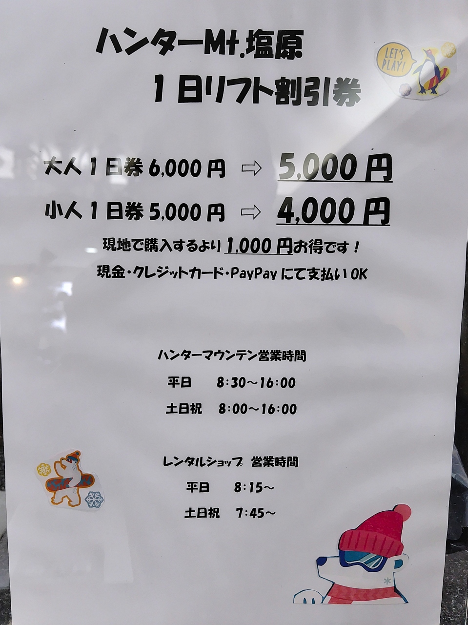 先ほど行ったハンターマウンテンのスキーリフト券はホテルで1000円引きの割引券も販売しています。