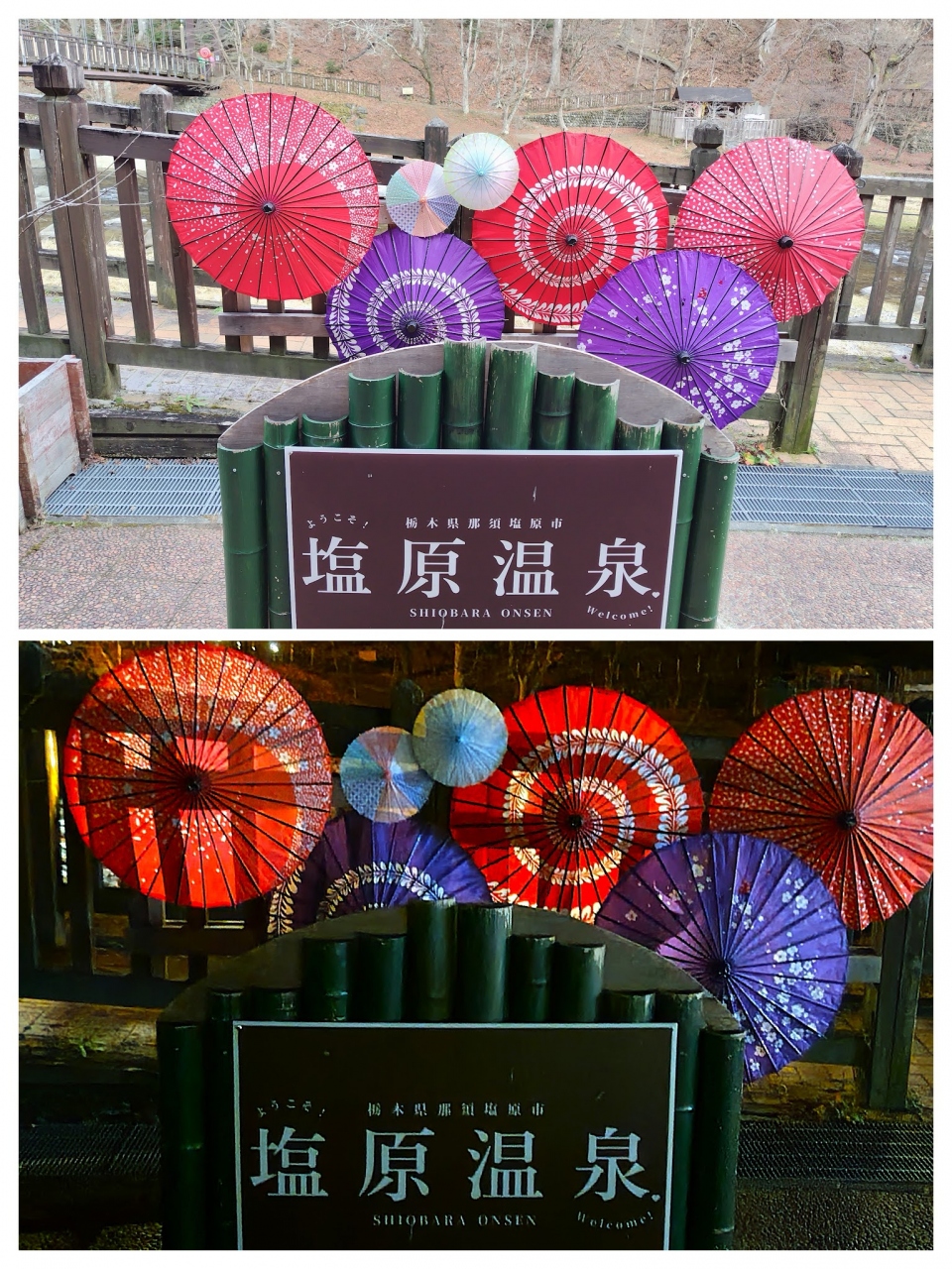 だいぶ前から建物の裏に流れる箒川沿いにカラフルな傘で作ったフォトスポットができていました。