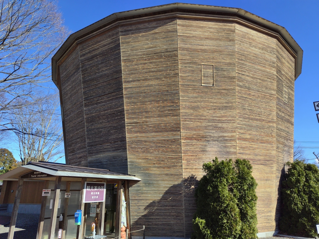 個性的な形の木造の多面的な建物は観光案内所・前売り券販売所・バス待合室です。「鹿の湯」の前売券を50円引きの450円で販売しているとインターネットに載っていたので、立ち寄りましたが、残念ながら今は扱っていないし、割引券も置いていないとのことでした。