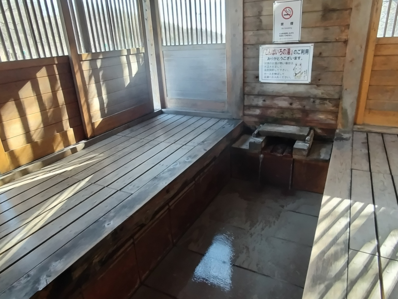 とても立派な、湯屋づくりの木造の味のある無料足湯所です。中央の入口から入ると左右対称に2つの足湯浴槽があります。