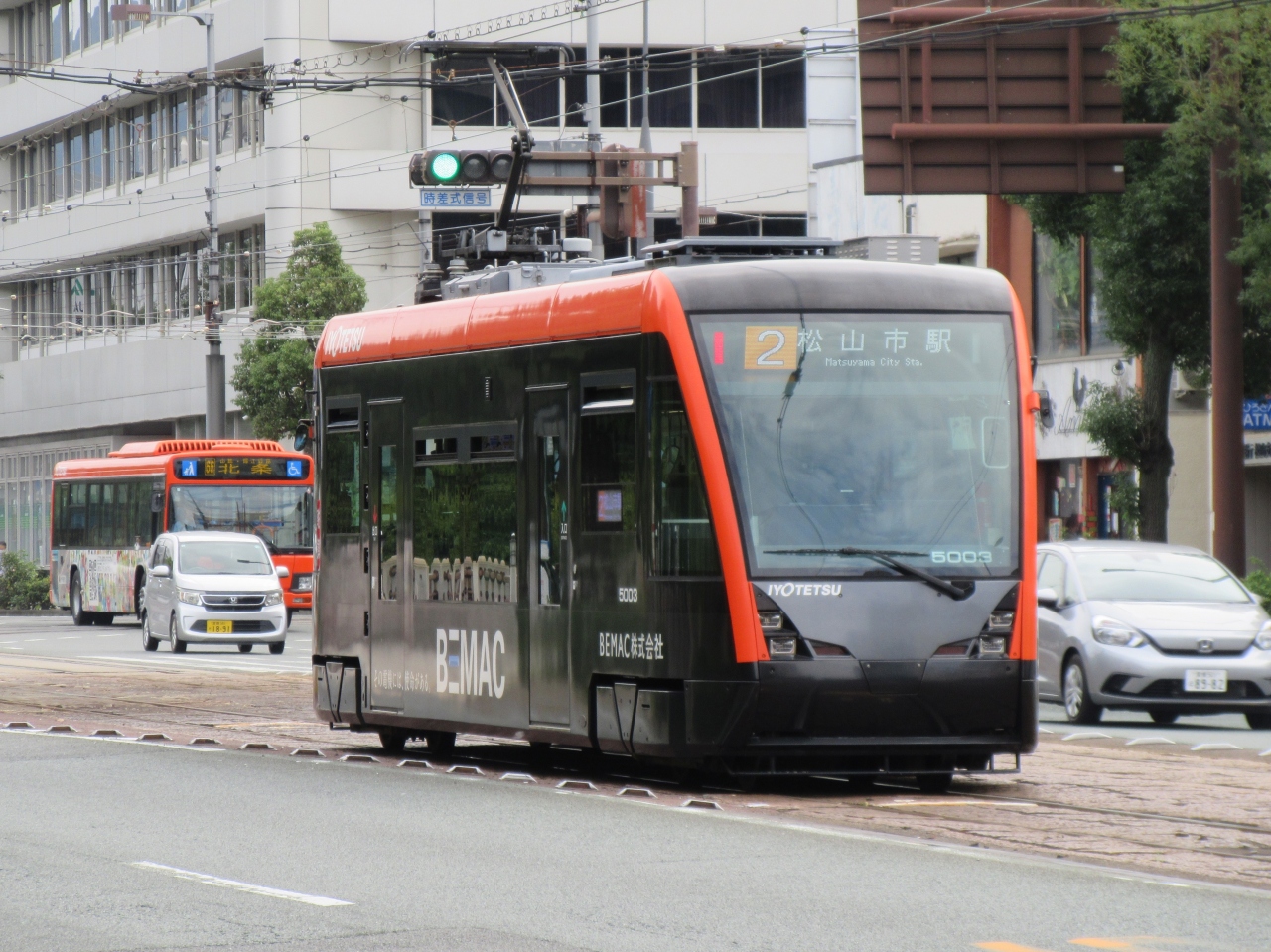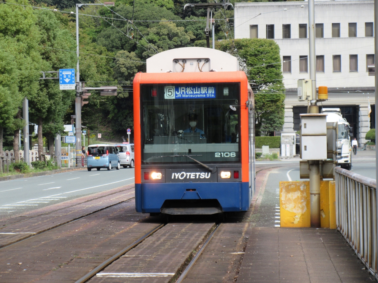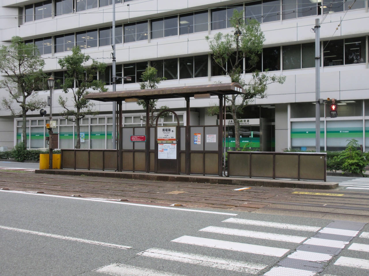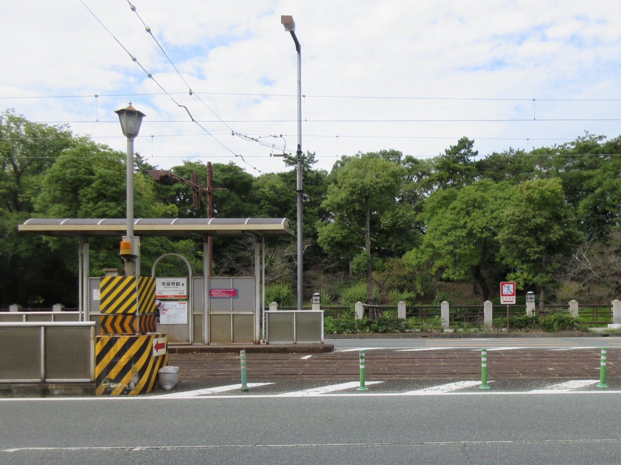 伊予鉄道市内線(路面電車)の停留場で、松山城外堀の東堀に沿った東堀端通りにあります。すぐ前に松山市役所の大きな建物があります。