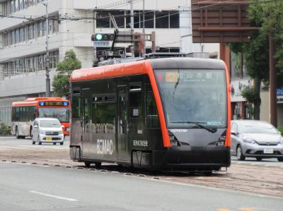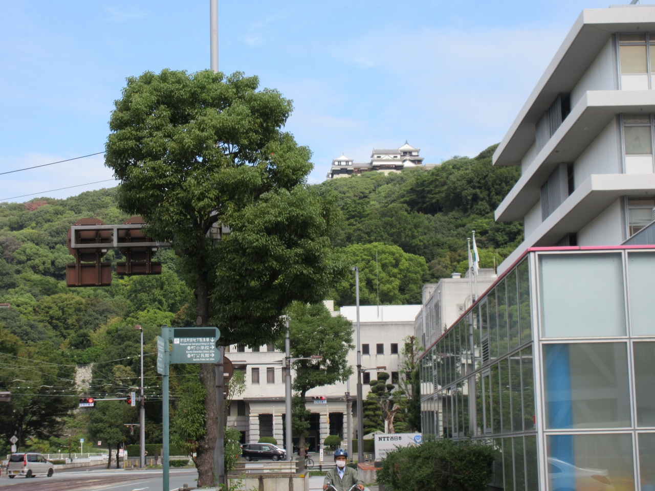 伊予鉄道市内線(路面電車)の市役所前停留場があって、そのすぐ前に松山市役所の大きな建物があります。