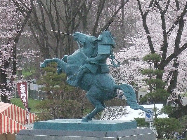 春は霞城公園は桜の花が満開になって、花に囲まれます。ピンクの桜の花の中の騎馬像も華やかで立派に見えます。そういう時期は訪れる人も多いですが、騎馬像よりは花の方を見ています。- 旅行時期