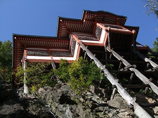 京都の清水寺の舞台に似た雰囲気で、唐松山の岩窟から突き出た床に観音堂が祀られています。横の階段から上がると、お堂の周囲には囲いもなく、扉もなく、床の上にしつらえられた台座に小さな観音像など3体が祀られています。