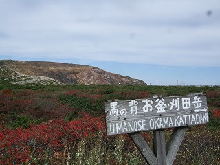 蔵王レストハウスの裏手に蔵王の御釜があります。右の刈田岳と、左の熊野岳へ向かう分岐があります。左の熊野岳に行くまで、右に御釜を眺めながら進むところを『馬の背』と呼んでいます。