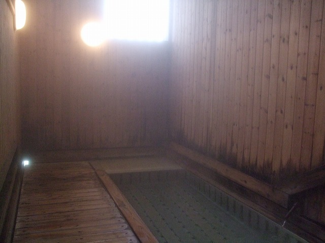 この共同浴場は、上から温泉が流れ出るのではなくて、湯船の中の床のすのこの隙間から出てきます。幾分青みがかった透明な温泉で、他の共同浴場のような濁り湯ではありません。時間がたつと空気に触れて次第に濁っていきます。